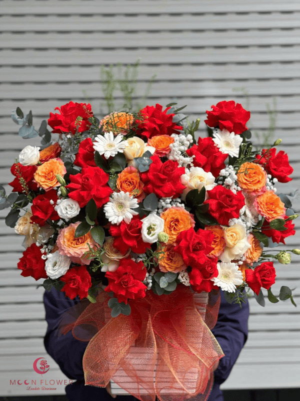 Giỏ hoa chúc mừng hồng đỏ hồng cam bao gồm: